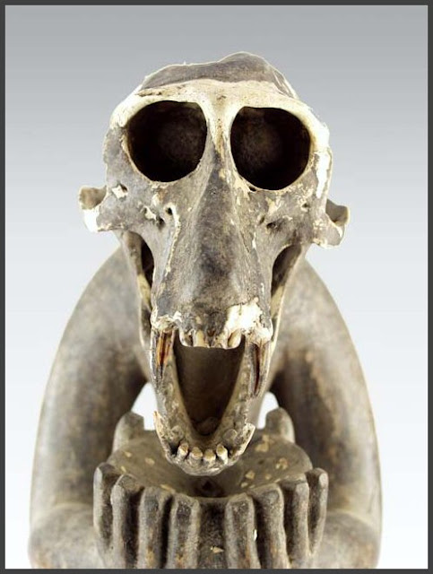 Baboons appear to be an ape highly connected to the moon from what my research suggests with accompanying mysterious yet aggressive attributes. In ancient Egypt, the baboon was apparently loyal to the lunar god Thoth with countless representations of this deity in baboon form, many in silver which also links back to the association with the satelitte. The potentially dangerous and aggressive creatures were also represented as ‘Hapi’ one of the four Canopic jar guardians and sons of Horus, Hapi protected the lungs. Further south in Africa, in Cote d’Ivoire, there is an abundance of baboon sculpture or 'Mbra'. "Baule Monkeys are powerful objects, which are forbidden to be seen in public display. Monkey figures share stylistic features with the mens´s sacred masks, and have some of the qualities of secrecy and danger to women. They combine animal and human traits in such way that it is nearly impossible to separate them, and they have the prominent teeth and boxy muzzle typical of the masks. Both also receive sacrificial offerings directly on the sculpture, and are associated with the bush. Mbra monkey figures, for example are kept in the village, but "fed" with sacrifices in the bush." - Susan Vogel. The last two images where Baule people have incorporated real baboon skulls have made them the most harrowing African sculptures I've seen!