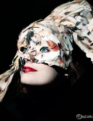 It's been a while but finally another post is here and better yet a post featuring my latest photoshoot with local photography company Obsidian AIC. The headdress used was constructed back in the Spring and I'd never found a use for it until now, so it was particularly pleasant to be there for this woodland shoot. The idea for the headdress came from Mongolian designs and you can see some of the design process in a previous post. The first set of more orange-hued images were taken by me, personally I'd like to think they convey an atmosphere of intrigue and mystery but with the close ups I'm also happy with how the collage blends into the face, distorting and morphing into her own appearance as opposed to simply wearing a mask. The photos by Obsidian project a more dramatic energy and I also believe the darkness of the background accentuates the post apocolyptic atmosphere, aided by the general outfit also.